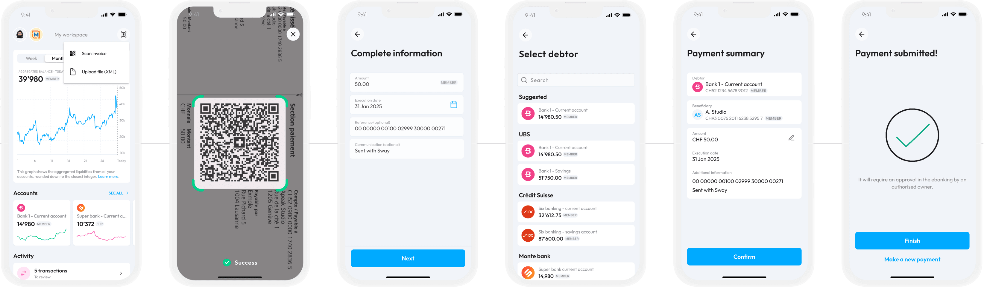 Heute können diese ihre Bankkonten einfach und schnell verknüpfen und jederzeit direkt in der Sway App Zugriff gewähren oder entziehen. Unsere Kundschaft kann über die Account Information-Schnittstelle auf alle ihre Transaktionen zugreifen, und wir haben spezielle Funktionen entwickelt, um ihre Liquidität zu konsolidieren und automatisiert Berichte für die Buchhaltungsteams zu erstellen. Dies löst einen ersten wichtigen Paint Point insbesondere für externe Buchhalter, da sie einfach auf diese Daten zugreifen können, ohne einen Bankzugang, Zeichnungsrechte oder ähnliches zu benötigen oder regelmässige Berichte manuell erstellen zu müssen.